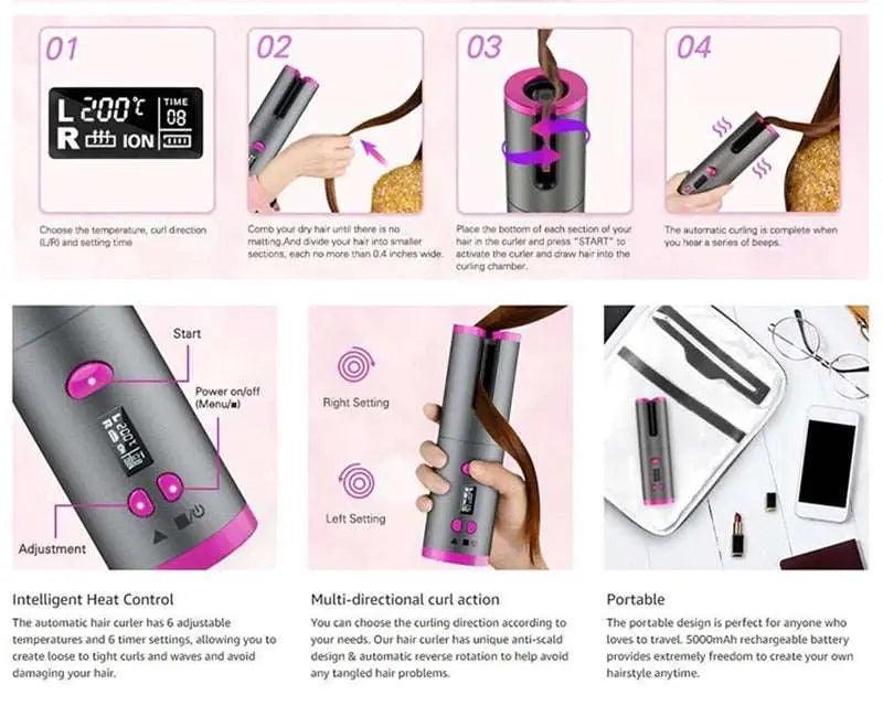 Looking for an effortless way to create stunning curls? BEAUTIRON presents the Cordless Rotating Hair Curler, your ultimate hairstyling companion. Featuring a cordless design and USB rechargeability, this hair curler is your go-to accessory for travel or quick touch-ups. An intuitive LCD display grants complete control over temperature settings, customizable between 250-430 degrees Fahrenheit to accommodate various hair types. Infused with ceramic tourmaline ionic technology, it promises to reduce frizz and enhance shine for an impeccable finish. The automatic rotating barrel delivers breathtaking, durable curls, swiftly and with ease. With a robust 5200mAh lithium-ion battery, the curler is designed for extended use. Enclosed in the package are essential accessories – two hairpins, a plastic comb, a USB charging cable, and a comprehensive English manual.